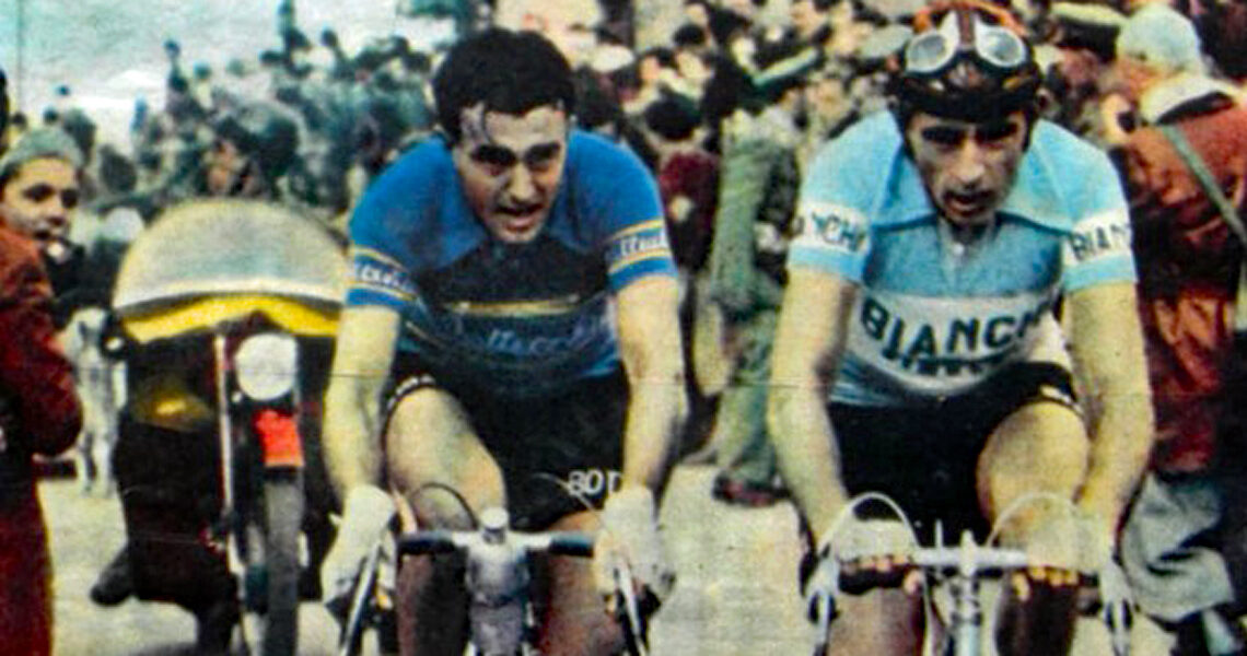 The legendary Fausto Coppi was the man of the times, unbeatable everywhere β heβd already won this race 4 times in 1946, 47, 48, and 49, and the cover of the program is a classic shot of Coppi and the 1951 winner Louison Bobet dueling over the top of the Madonna del Ghisallo climb. Coppi had been the first over the decisive climb in all his previous wins, but wound up 3rd in 1952, behind Bobet and Minardi.