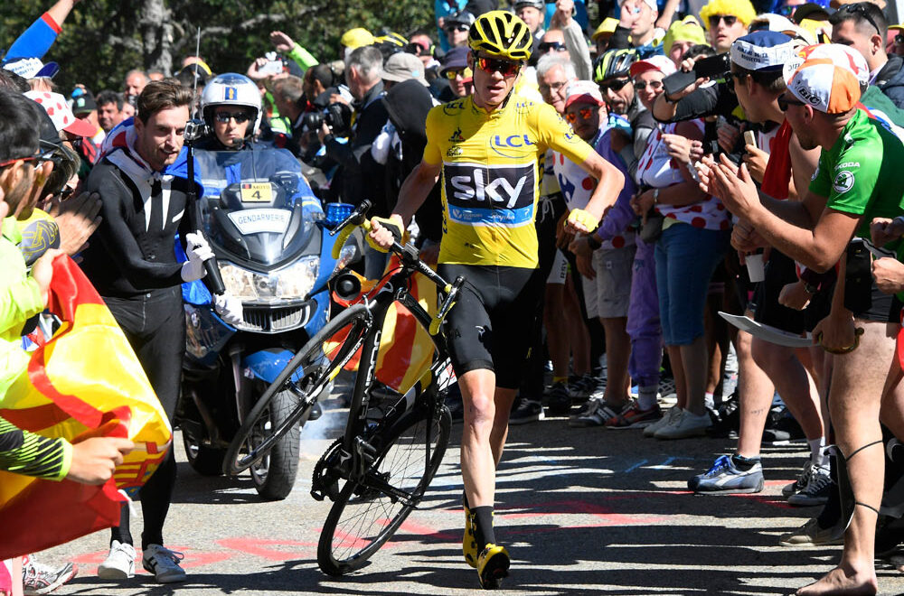 In what was possibly the most bizarre and surreal moment ever, during the 2016 Tour de France, Chris Froome was involved in a crash on Mont Ventoux with a TV motorbike. His bike was badly damaged and he had no immediate replacement available to him β so Froome then started to run up the mountain in his cycling shoes, and this was quite the sceneβ¦ one that left everyone watching it speechless.